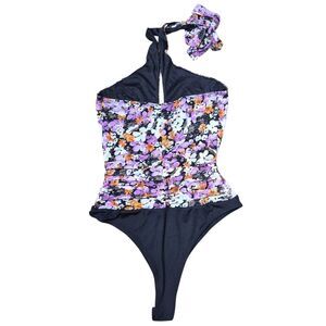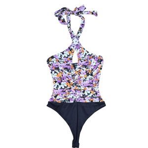 Lulu's Blossoming Perfection Black Floral Mesh Cutout Halter Bodysuit Size Small