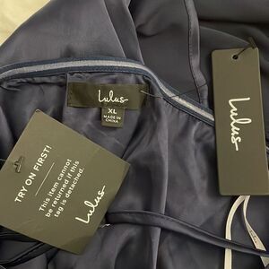New with tags (NWT), navy blue, 100% polyester, satin, one-shoulder, asymmetrical, midi, Law of Attraction, cocktail, dress by Lulus in a women's size extra large XL. Style number 1428176. Dress has a hidden side zipper closure and adjustable spaghetti strap. Silicone, no-slip strips on interior or top edge to help keep it in place. Mini skirt with an overlapping asymmetrical midi skirt with a side slit. Fully lined. Hand washable. Perfect for your next semi-formal, special occasion like prom, a wedding or a cocktail party. In excellent, new, unused condition.