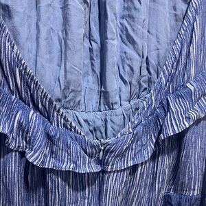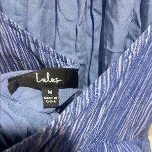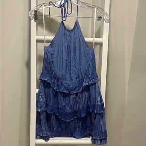 Super cute low back with zip blue halter dress- ruffle details. Mini sundress - perfect for summer!! draw string tie at neck.