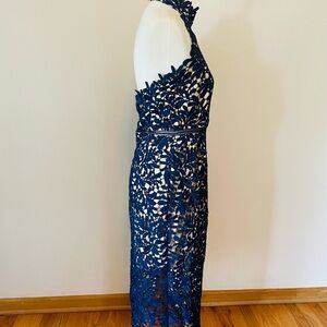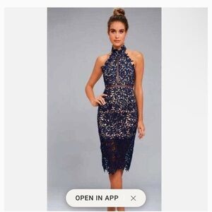 Elevate your evening with this exquisite blue sheath dress from Lulu's, designed with a sophisticated halter neckline and a sleeveless silhouette. Perfect for cocktail occasions, the dress features intricate lace detailing that adds a touch of elegance and depth. Its form-fitting design and midi length create a timeless and refined look, ideal for any night out.