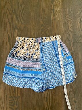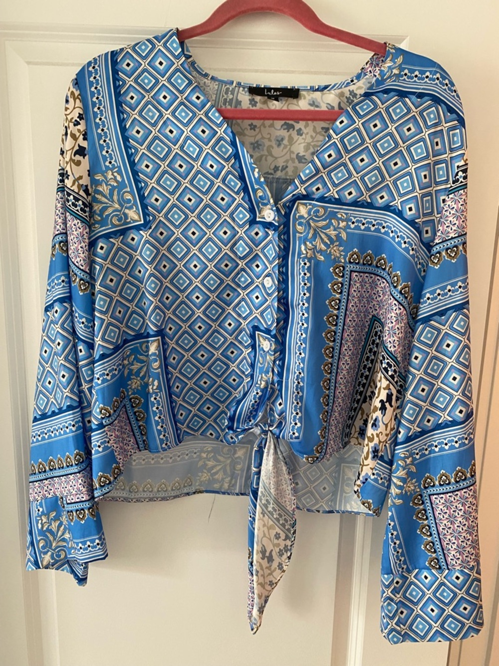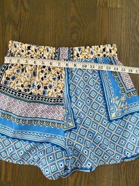Lightweight printed blouse with a front tie and matching shorts. Button-front placket and v-neckline. Mixed geometric and paisley-inspired panels. Soft drape for casual or dressy looks.