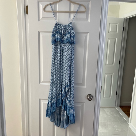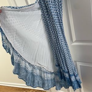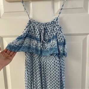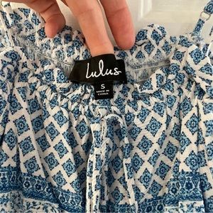 Super cute, easy spaghetti strap dress with ruffle at top and bottom from Lulus. Faux wrap look in front is super flattering. Fully lined. Blue and white pattern. Worn only a couple times. Smoke free pet free. Bundle and save!