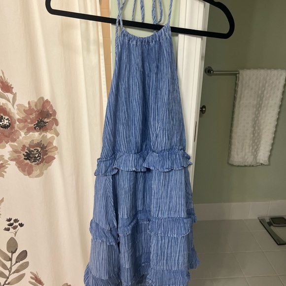 Chic blue halter dress with ruffled layers. Perfect for summer outings.