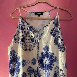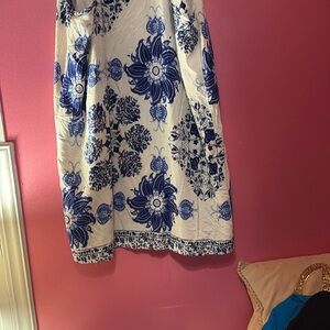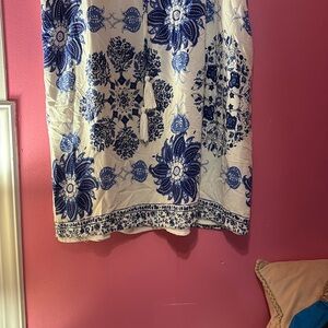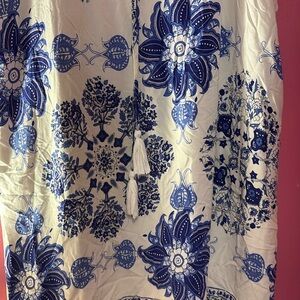 Elegant blouse with intricate blue floral design on white fabric. Ideal for chic occasions.