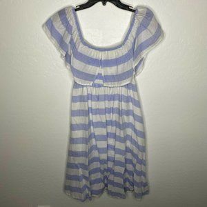 Chic off-shoulder midi dress. Blue and white stripes. Perfect for summer outings.