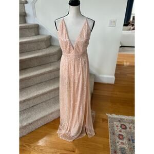 Excellent condition. Blush pink, fully covered in sequins. Backless, deep plunge v-neck, maxi length with thigh high slit. Back zipper.