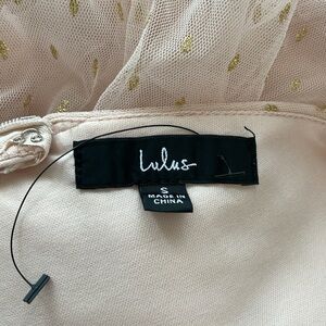 Lulu’s Blush Pink Sleeveless Tiered Tulle Mini Dress with gold dots. Size small. In very good preowned condition. No stains. Romantic, Whimsical, Wedding guest, Party, Holiday. Armpit to pit measures 14 inches. Top of shoulder down 31 inches. Comes from a smoke free home.