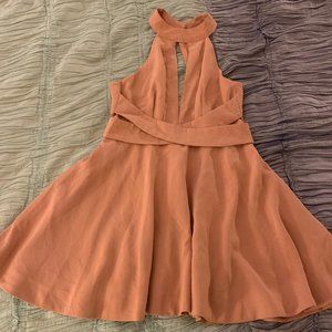 Backless, plunging front, skater dress. Zip closure with a magnetic closure for the back/neck straps. Incredibly flattering - cinches in at the waste and drapes out. Thick, good quality fabric in a beautiful mauve/blush color. Worn once for graduation photos.