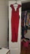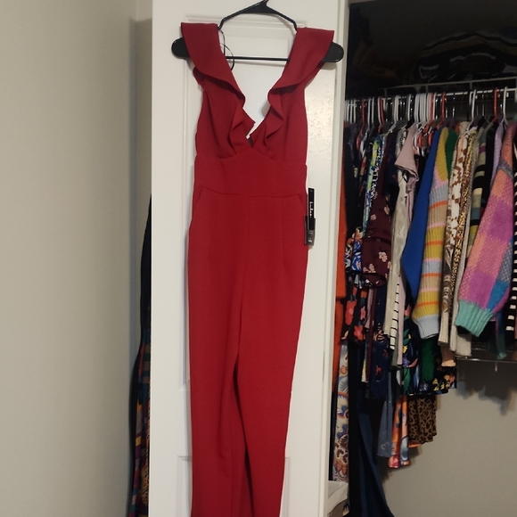 Chic red jumpsuit with ruffled neckline. Perfect for making a statement or holiday party