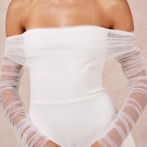 Lulus Bridal Beautifully Beloved White Mesh Off-the-Shoulder Gown Maxi Dress. Airy mesh shapes sheer, barely-there, ruched sleeves with elastic, mermaid-style silhouette with a graceful train at back. Hidden zipper/clasp at back. Fabric is very stretchy.