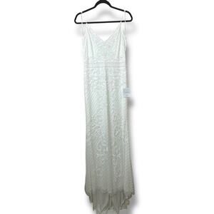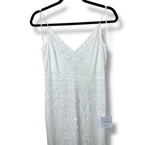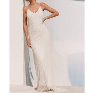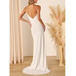 Lulus Bridal Cherished Vow White Beaded Backless Mermaid Wedding Gown Maxi Dress. Mesh Fabric, beaded design of crisscrossing lines, floral flourishes with sequin accents. Bodice has a v-neckline ultra-flattering fit. Mermaid-style silhouette, glamorous train. Hidden zipper/clasp at back. Fabric has some stretch. Note: The tiniest blemish at lower back zipper. Not noticeable. See last photo.