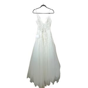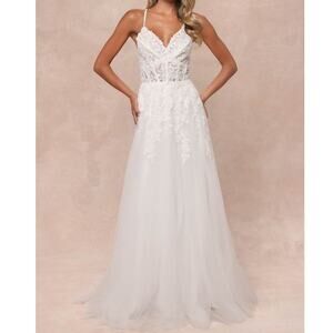 Lulus Bridal NWT Glorious Luxury White Sheer Tulle Embroidered Beaded Maxi Gown