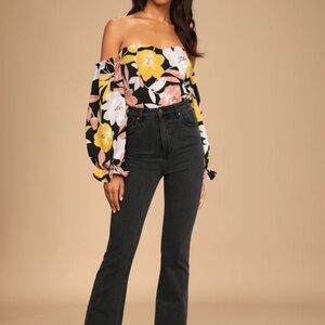 Lulu's Bring the Blossom Black Floral Print Off-the-Shoulder Bodysuit