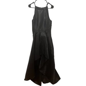 Raise a glass in the Broadway Show Black High-Low Gown! Medium-weight woven taffeta, with a high shine sheen, shapes this show-stopping gown with adjustable spaghetti straps, an apron neckline, and a princess-seamed bodice. Fitted, banded waist sits atop a flowy, high-low maxi skirt with box pleats, side seam pockets, and a voluminous silhouette. Hidden back zipper/clasp.
