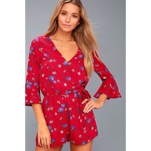 Lulus Bronwen Red Floral Print Flounce Sleeve Romper, Size XS