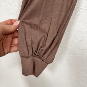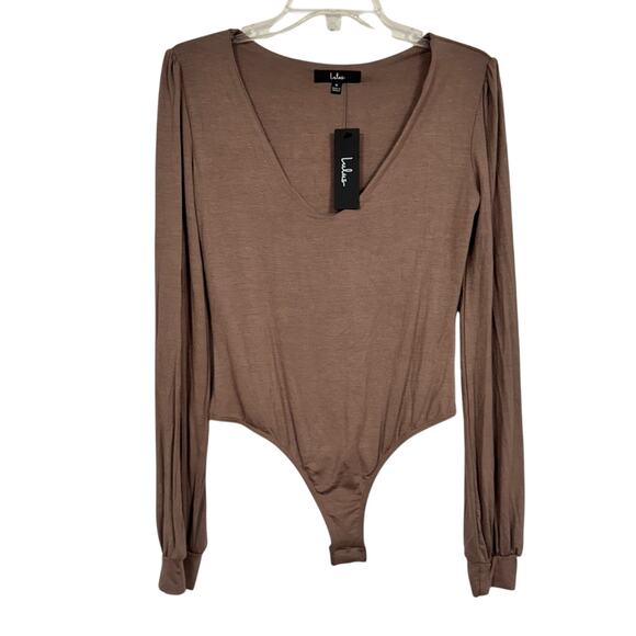 Lulus Brown V Neck Long Sleeve Bodysuit Womens M Casual Blouse Puff Sleeve Top