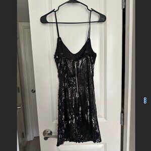 Sequin Lulus mini dress worn once! Excellent condition -- no flaws. Stunning black sequins dazzle across this mesh dress that has adjustable straps, a V-neckline, and a sleeveless bodice. The figure-skimming fit continues down to a mini hem. Exposed back zipper.