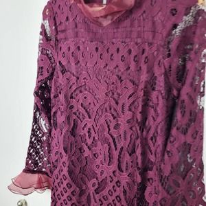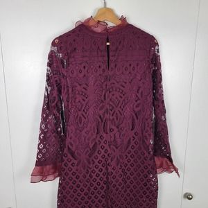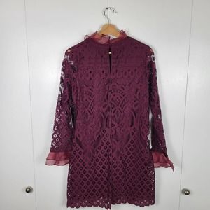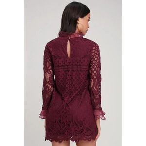 Elegant burgundy lace mini dress. Features long sleeves and high neckline. Perfect for special occasions.