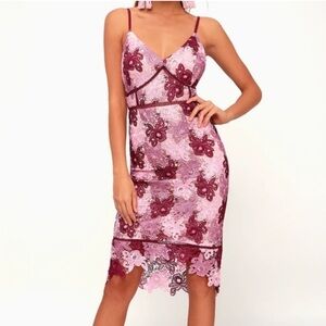 Chic lace dress with floral patterns. Features a fitted silhouette and delicate straps. Ideal for special occasions.