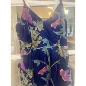 The Lulus Burnout Velvet Asymmetrical Dress in size M features a romantic floral pattern with a blue color, perfect for a fairy-like or goth-inspired look. The dress is made of velvet fabric and has a midi length, making it suitable for weddings, parties, or formal occasions. With its slimming design and side slit detail, this dress from Lulus is sure to make a statement and turn heads wherever you go. Perfect for those looking to add a touch of history and fantasy to their attire.
