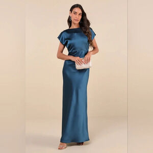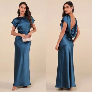 Lulus Captivating Presence Dark Teal Satin Cowl Back Maxi Dress L Wedding Party. See all pictures for details.