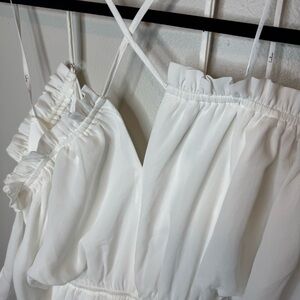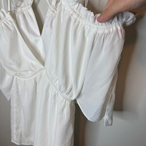 Lulus Exclusive! The Lulus Catch Me Crushing White Off-the-Shoulder Romper is giving us major butterflies! Breezy chiffon falls from adjustable spaghetti straps, into an elasticized, off-the-shoulder neckline, with a cute strappy detail, into fluttery slit short sleeves. A blousy bodice and elasticized waist top matching shorts. Plunging V-back.