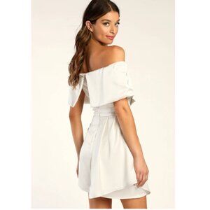 The party seems to follow the Lulus Always Celebrating Ivory Satin Off-the-Shoulder Mini Dress! Sleek woven satin sweeps across a sexy off-the-shoulder neckline (with hidden no-slip strips), a surplice bodice, and short sleeves. Gathered high waist sits above a mini skirt with an asymmetrical overlapping panel. Hidden back zipper/clasp.