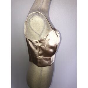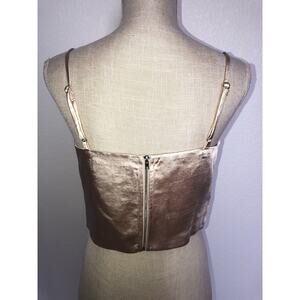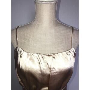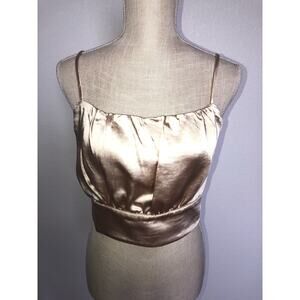 This top is perfect for dressing up or down, a great minimalist style. It is a lovely champagne color, so it will complement any outfit. It has a rounded neckline that is accented with spaghetti straps. The back has a zipper closure, and the straps are adjustable. It is cropped and has a banded look to give extra detail and style. New with tags and in manufacturer packaging.