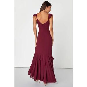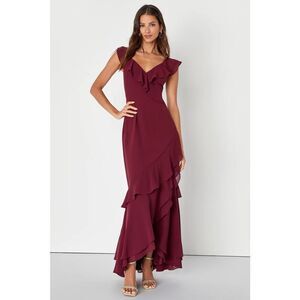 Lulus Charming Event Burgundy Asymmetrical Ruffled Maxi Dress