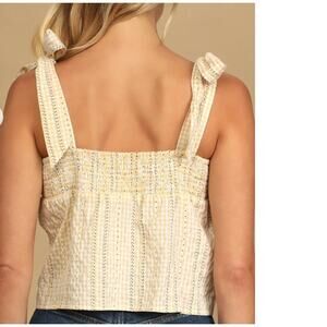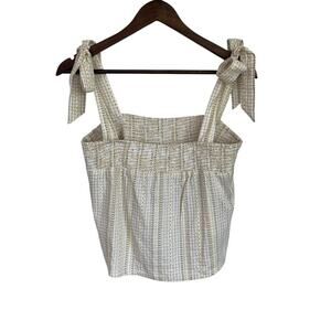 This cutie top is a summer staple thanks to a sweet gingham print, wide tying tank straps, and a smocked straight neckline. The breezy bodice ends at a cropped hem. Brown printed detail creates an embroidered effect all throughout.