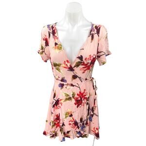 Lulus Cherished Love Blush Pink Floral Short Sleeve V-Neck Mini Wrap Dress Size M