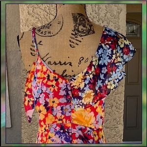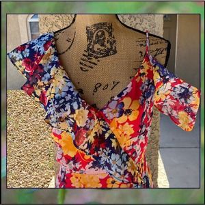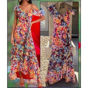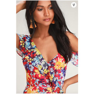 Twirl all of your problems away in the Lulus Radiant Ruby Red Floral Print Chiffon Maxi Dress! Red chiffon, with a yellow, blue, and white floral print, constructs this beautiful asymmetrical maxi dress with a V-neckline and darted bodice. An empire waist and faux wrap bodice are supported by a thick tank strap and a cold shoulder, with an adjustable strap, that are both sweetly accented by ruffle details that carry into the pretty maxi skirt with a tiered ruffle hem. Hidden clasp/zipper at back.