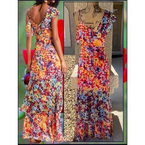 Lulus Chiffon Floral Print Radiant Ruby Maxi Dress Size S