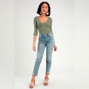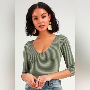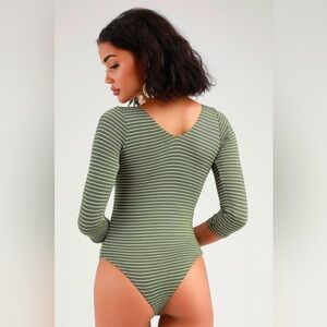 Super cute green striped bodysuit from Lulus. V-neckline, thong bottom, and 3/4 sleeves. Size Medium and in great preowned condition; no visible flaws.