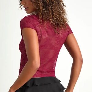 Lulus Clearly Sultry Burgundy Lace Sheer Short Sleeve Top Red - Size L