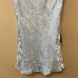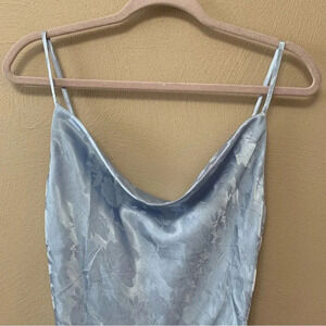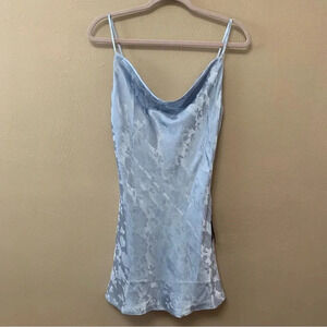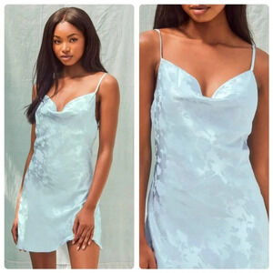 You won't want to stray far from the Lulus Close to Your Heart Dusty Blue Satin Jacquard Cowl Slip Dress! Sleek woven satin, with a romantic rose pattern embossed throughout, shapes a cowl neckline that drapes below adjustable spaghetti straps. Figure-skimming slip silhouette ends at a flirty mini hem. Hidden back zipper/clasp.