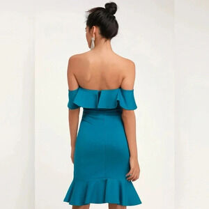 Lulus Exclusive! The Lulus Confidence Boost Teal Blue Off-the-Shoulder Bodycon Dress is just what you need for an epic night out! Medium-weight stretch knit shapes a ruffled, off-the-shoulder flounce bodice with no-slip strips. Fitted waist leads to a bodycon midi skirt with ruffled hem. Hidden back zipper/clasp.