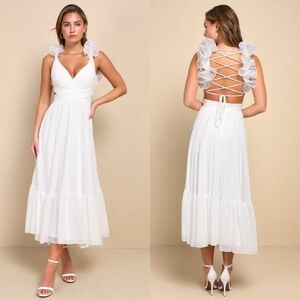 Lulus Contemporary Poise White Pleated Ruffled Lace-Up Midi Dress S Wedding