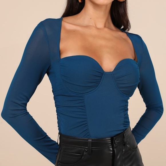 Your date will be in awe of you all night long when you're wearing the Lulus Coy Cutie Teal Blue Mesh Bustier Long Sleeve Crop Top! This sultry mesh top starts with a bustier-inspired bodice with padded cups and supportive underwire, a flirty sweetheart n