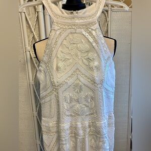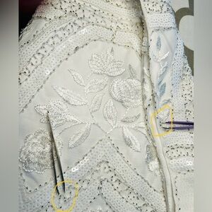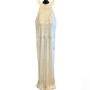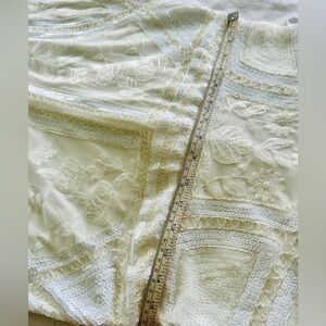 Elegant cream jumpsuit with intricate embroidery. Halter neckline. Perfect for special occasions. I couldn't fit into the Medium but the XL was too big for me. It's so stunning though.