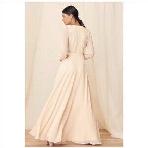 This stunning cream gown by Lulu's features a sophisticated wrap design with a deep V-neckline and elegant bishop sleeves. The pleated skirt and dramatic side slit add a touch of romance, making it perfect for a wedding guest or cocktail occasion. Its light, airy fabric ensures graceful movement, creating a timeless and chic silhouette.