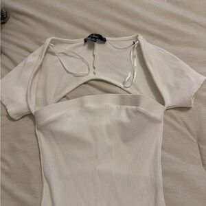 Elegant cream bodysuit with ribbed texture. Ideal for versatile styling.