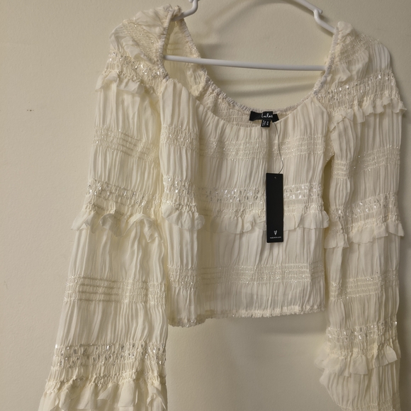 NWT cream blouse with ruffled and glitter details. Perfect for stylish outings.