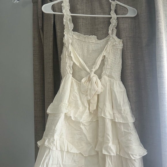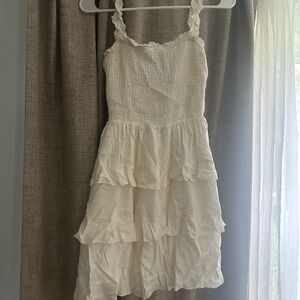 Chic mini dress with ruffled layers. Smocked bodice and tie detail. Perfect for any occasion.