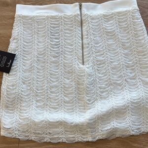 This cream mini skirt features a chic pencil silhouette with elegant ruffled details, perfect for a night out or cocktail event. Its smooth waistband ensures a comfortable fit, while the layered design adds a touch of sophistication.