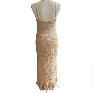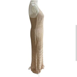 Chic patterned crochet sculpts your figure in this flattering maxi dress that features a v-neckline and spaghetti straps.