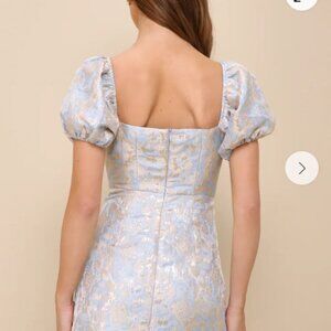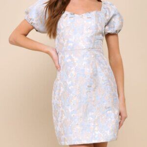 Lulus Cutest Praise Light Blue Floral Jacquard Puff Sleeve Mini Dress - Size L