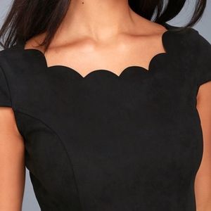 Stretchy, medium-weight, vegan suede shapes a princess-seamed bodice, with cap sleeves, and a feminine scalloped bateau neckline that's sure to impress. Fitted waist flairs into a flirty skater skirt. Hidden side zipper.