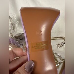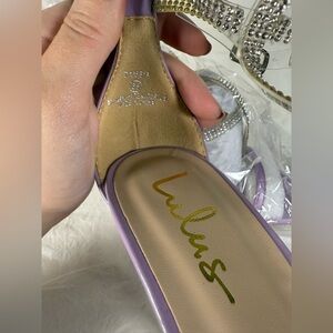 Brand New With Tags/Box. Lulus Damsia Purple Rhinestone Open Toe Ankle Strap. Smooth lavender faux leather shapes a trendy open-toe bed and a slender toe strap, while clear vinyl straps, adorned with rhinestones, create a gladiator-inspired vamp and two adjustable ankle straps. The wrapped stiletto heel lends height and sultriness to this party-ready shoe. Size 8.5.