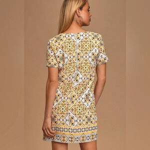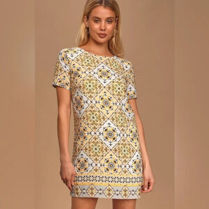Make a fierce fashion statement in the Lulus Dandy Lion Yellow Print Shift Dress! Short sleeves and a rounded neckline flow into a woven shift dress with a beige, taupe, and yellow tiled print. Exposed silver back zipper.